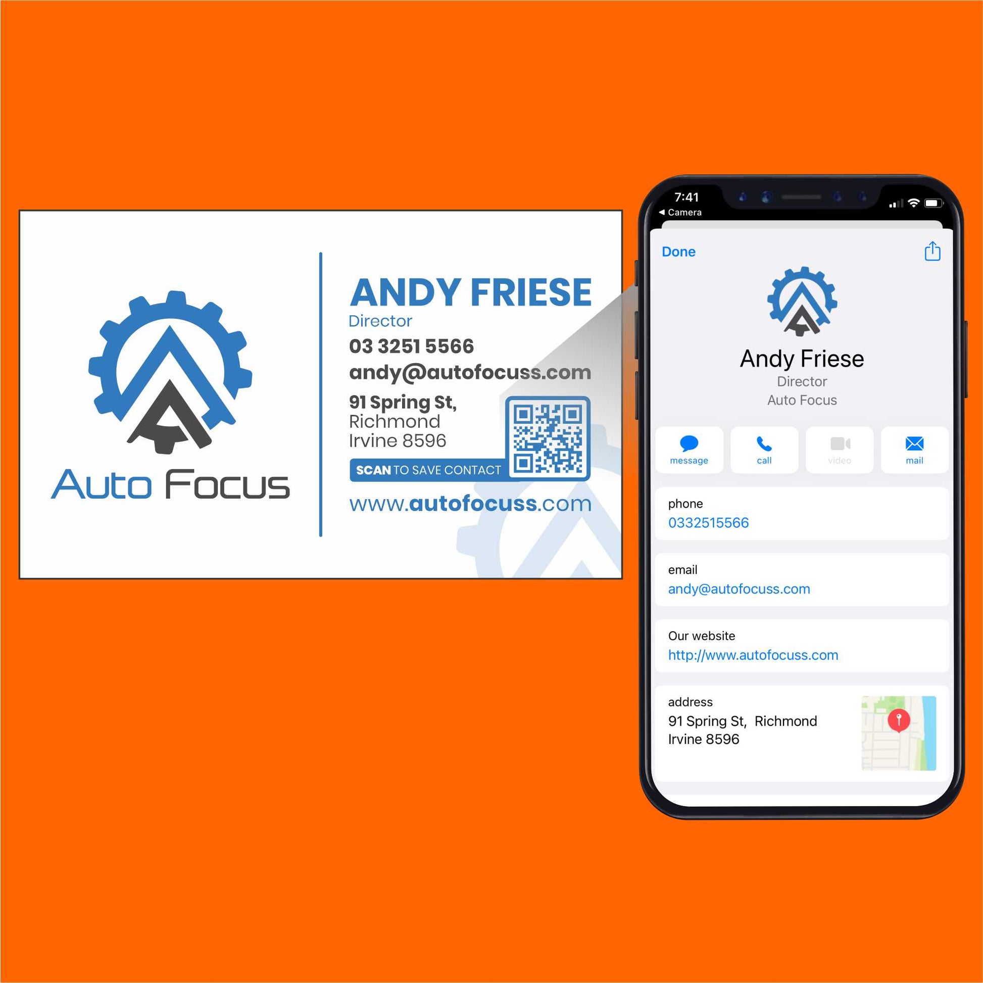 Level up your business card with a QR code that lets a customer scan and upload your contact details straight into their phone ‘contacts’ list. Works with any modern phone camera.